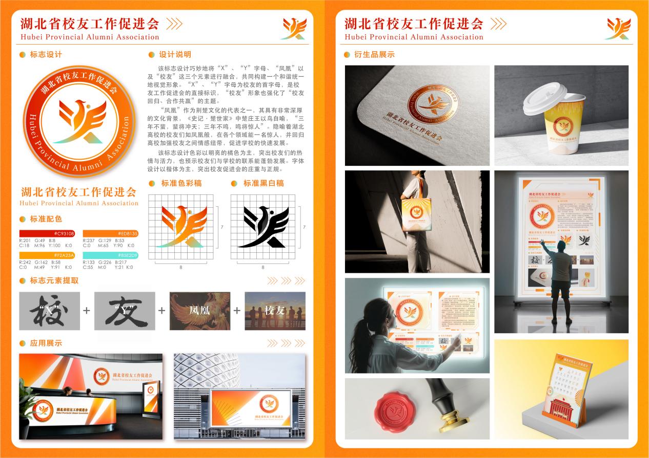 该标志设计巧妙地将“X”、“Y”字母、“凤凰”以及“校友”这三个元素进行融合,共同构建一个和谐统一地视觉形象。“X”、“Y”字母为校友的首字母,是校友工作促进会的直接标识,“校友”形象也强化了“校友回归、合作共赢”的主题;“凤凰”作为荆楚文化的代表之一,一直具有非常深厚的文化背景,《史记·楚世家》中楚庄王以鸟自喻,“三年不蜚,蜚将冲天;三年不鸣,鸣将惊人”。这隐喻着湖北高校的校友们如凤凰般,在各个领域能一名惊人,并回归高校加强校友之间情感纽带,促进学校的发展;该标志设计色彩以明亮的橘色为主,突出校友们的热情与活力,也预示校友与学校的联系能蓬勃发展。字体设计以楷体为主,突出校友促进会的庄重。
