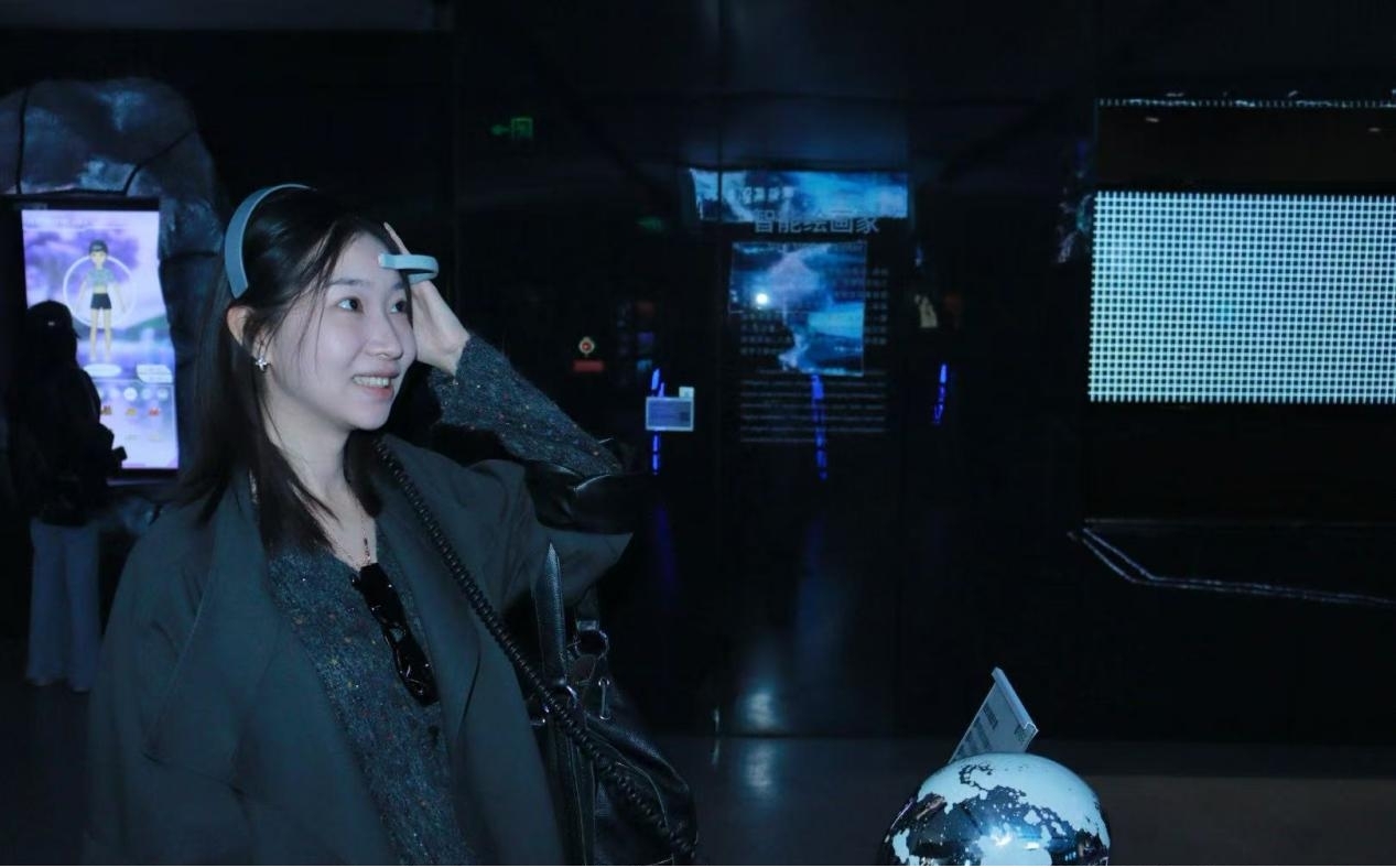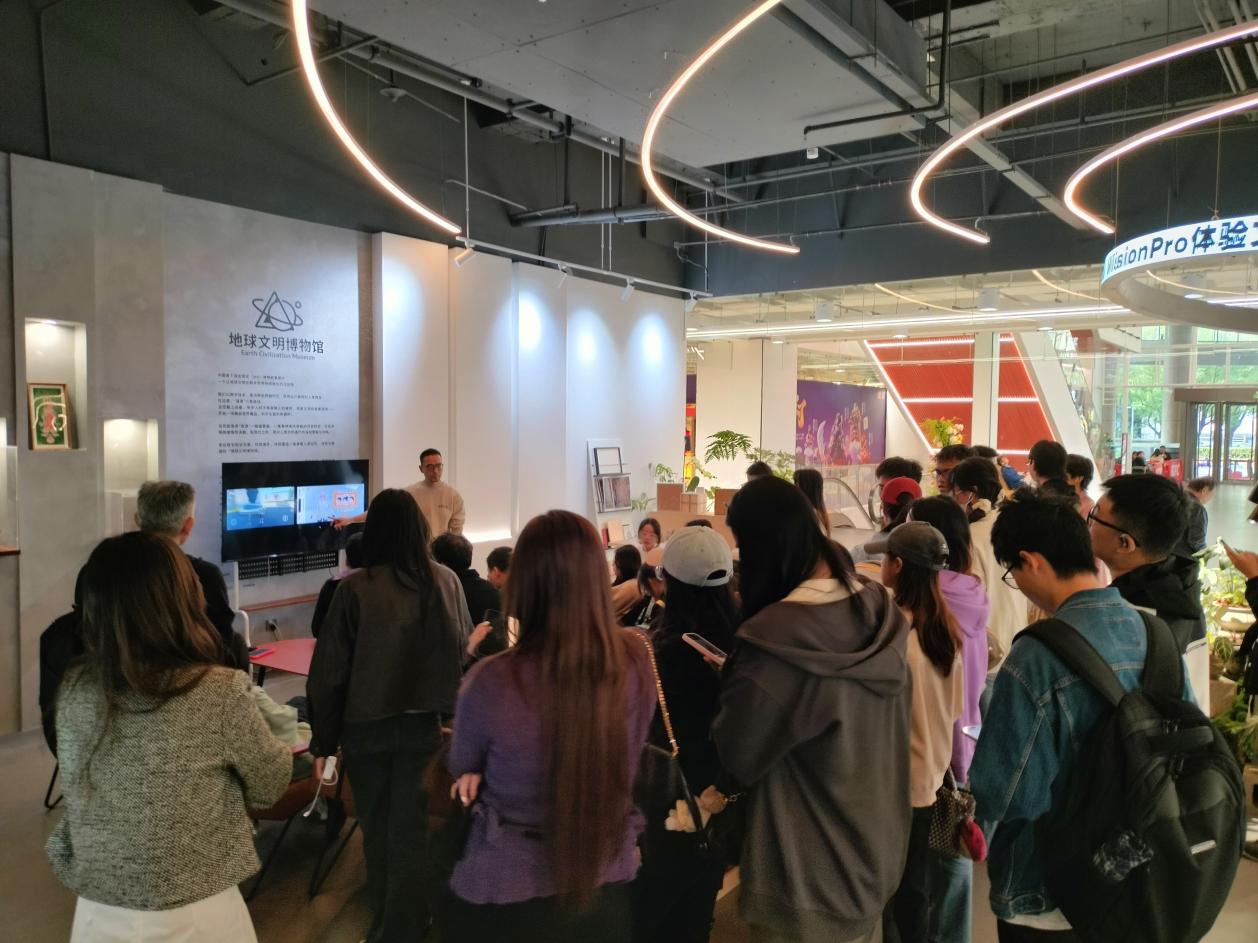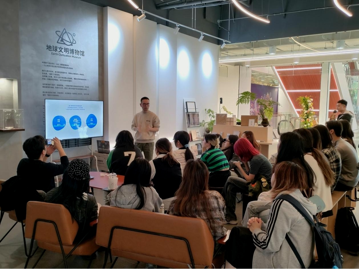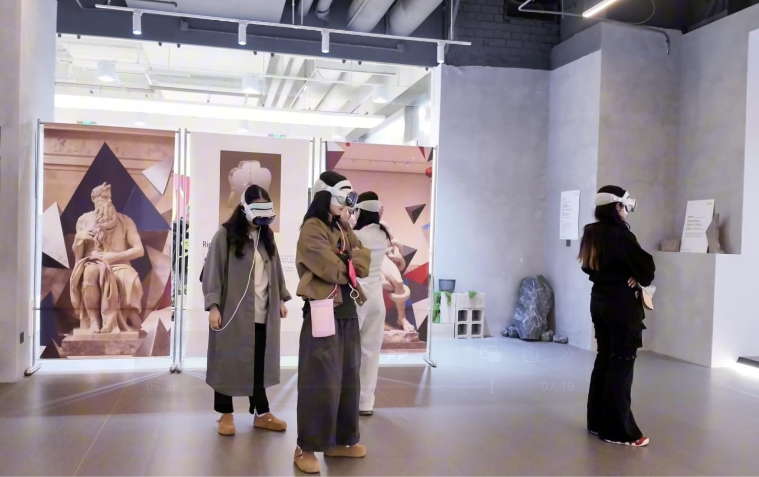 在上海的最后一站,考察团重点聚焦数字艺术产业园区与商业数字艺术空间,参观了多家新媒体艺术展厅,欣赏了数字绘画、互动装置及沉浸式表演等多样化艺术形态,深入了解了产业园区在创意孵化、资源整合和与市场转化中的运作机制。特别是在上海中华艺术宫的《达·芬奇·时空之轮》和艾洛互动公司的《地球文明博物馆》MR沉浸式艺术体验展中,师生们亲身体验了基于头戴式MR设备的大空间沉浸式艺术创作形式。展览通过混合现实(MR)技术将虚拟影像与现实空间实时融合,观众在佩戴头显后可自由行走、交互观察,在虚拟与现实的叠加环境中感受艺术叙事的空间延展与动态生成。