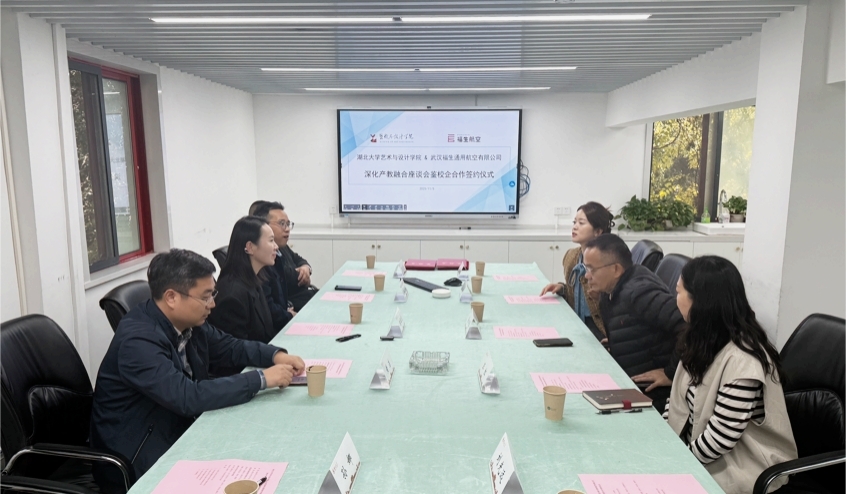 近日,湖北大学艺术与设计学院与武汉福生通用航空有限公司校企合作座谈会暨签约仪式成功举行。我院余日季副院长、王红主任、刘慧、刘光远、胡冰洁老师出席,武汉福生公司董事长陈昭言女士率设计总监翟杰玉、技术总监陈东东、行政总监孙娜以及黄浩教授代表参会。