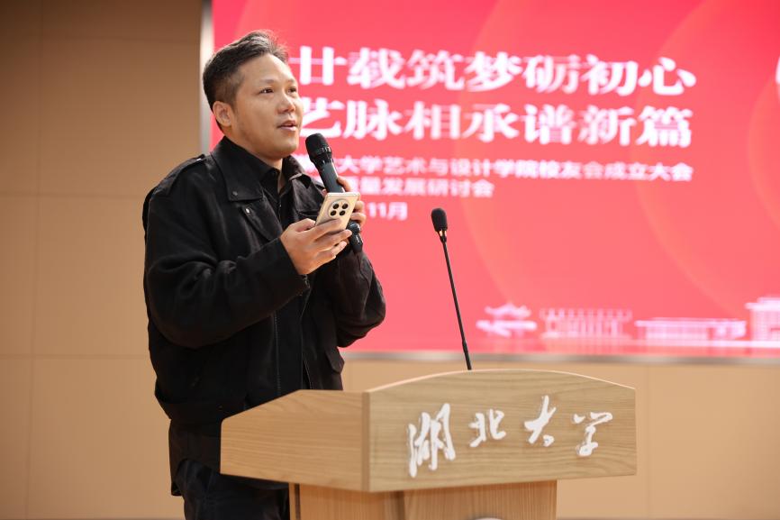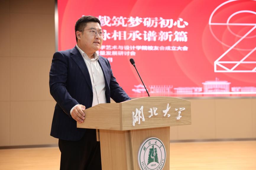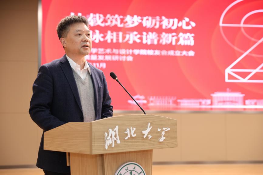 校党委副书记侯勇致辞指出,艺术与设计学院二十年风雨兼程,实现了跨越式发展,艺术与设计学院校友会的成立,标志着广大艺术与设计领域校友有了凝聚情感、汇聚智慧、共促发展的官方平台与坚实纽带。面对“两个大局”的时代背景,站在“双一流”建设的关键节点,需要立足“大格局”,在服务学校“双一流”建设中展现新作为,锚定“高目标”,在构筑湖北文化高地上彰显新担当,织密“情感网”,在打造一流校友共同体上探索新路径。