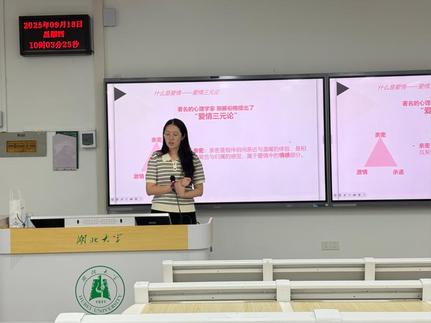 在讲座中,王嘉莹老师以著名心理学家斯滕伯格的“爱情三元论”为切入点引入主题,明确指出健康的恋爱关系需由亲密、激情、承诺三个维度相互支撑。她凭借扎实的心理学专业知识与丰富的实践经验,从科学视角深入剖析了恋爱中的核心心理机制,让理论讲解更具说服力。