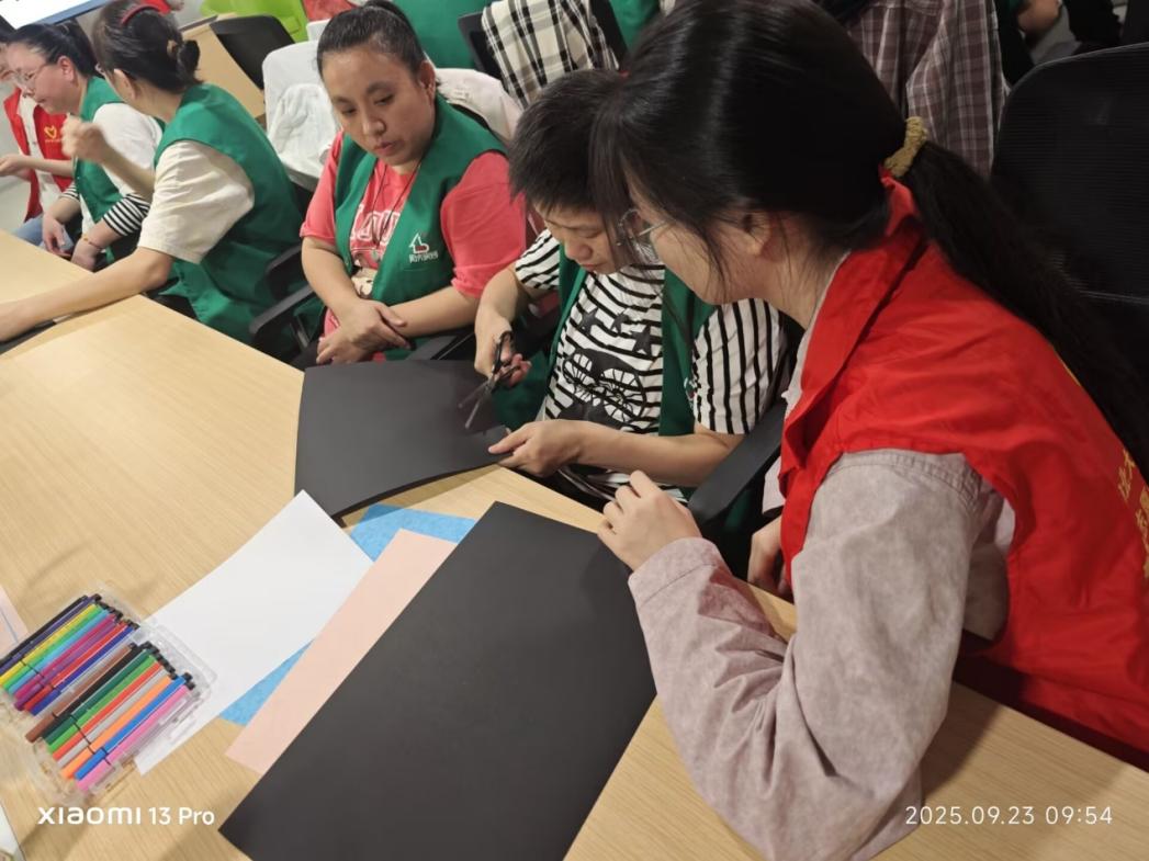 活动伊始,志愿者们采用了“一对一”的贴心陪伴模式。他们不仅是小老师,更是耐心的倾听者和协助者。对于行动不便的参与者,志愿者会细心帮其固定画纸、调换颜料,并用生动的语言描述秋日的色彩与形态,引导他们去感受不同形状的树叶模型,用心去“看见”秋天。在创作过程中,志愿者们也适时介绍垃圾分类知识,例如将落叶归类为厨余垃圾,废弃画笔、颜料包装等归类为其他垃圾或可回收物,让环保理念在轻松互动中深入人心。